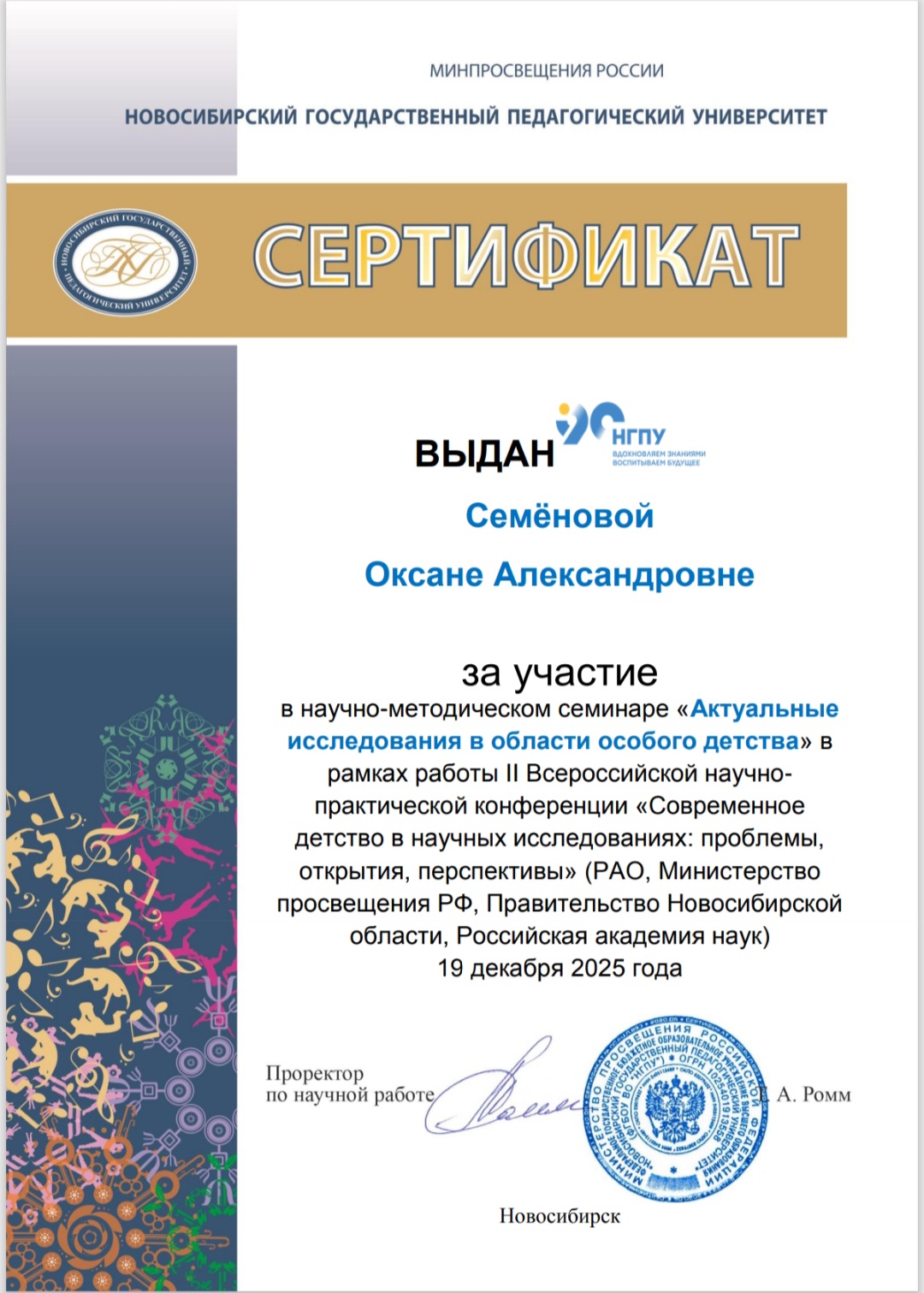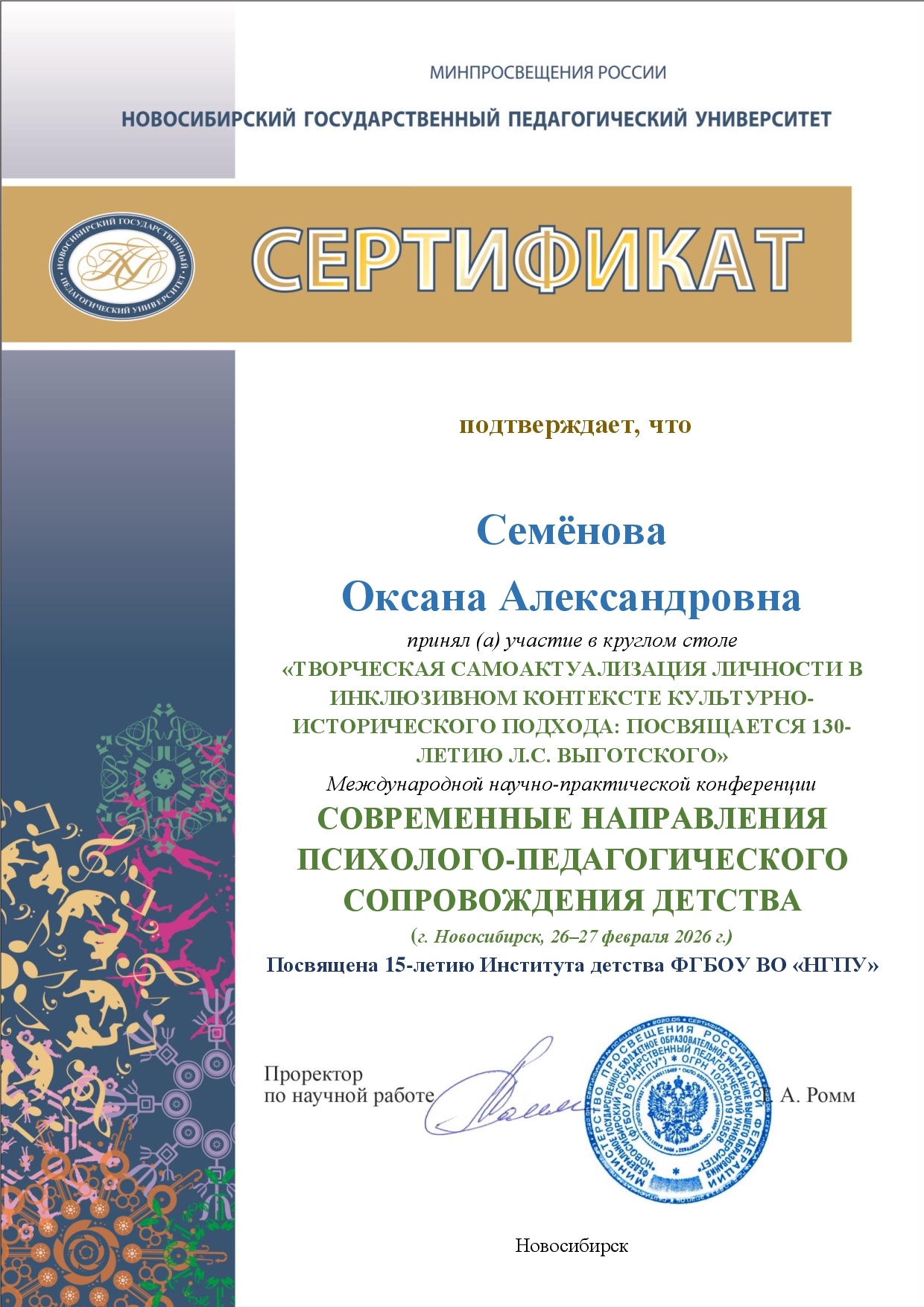 Сертификат:"Дошкольное воспитание. Новые ориентиры. Новосибирск"