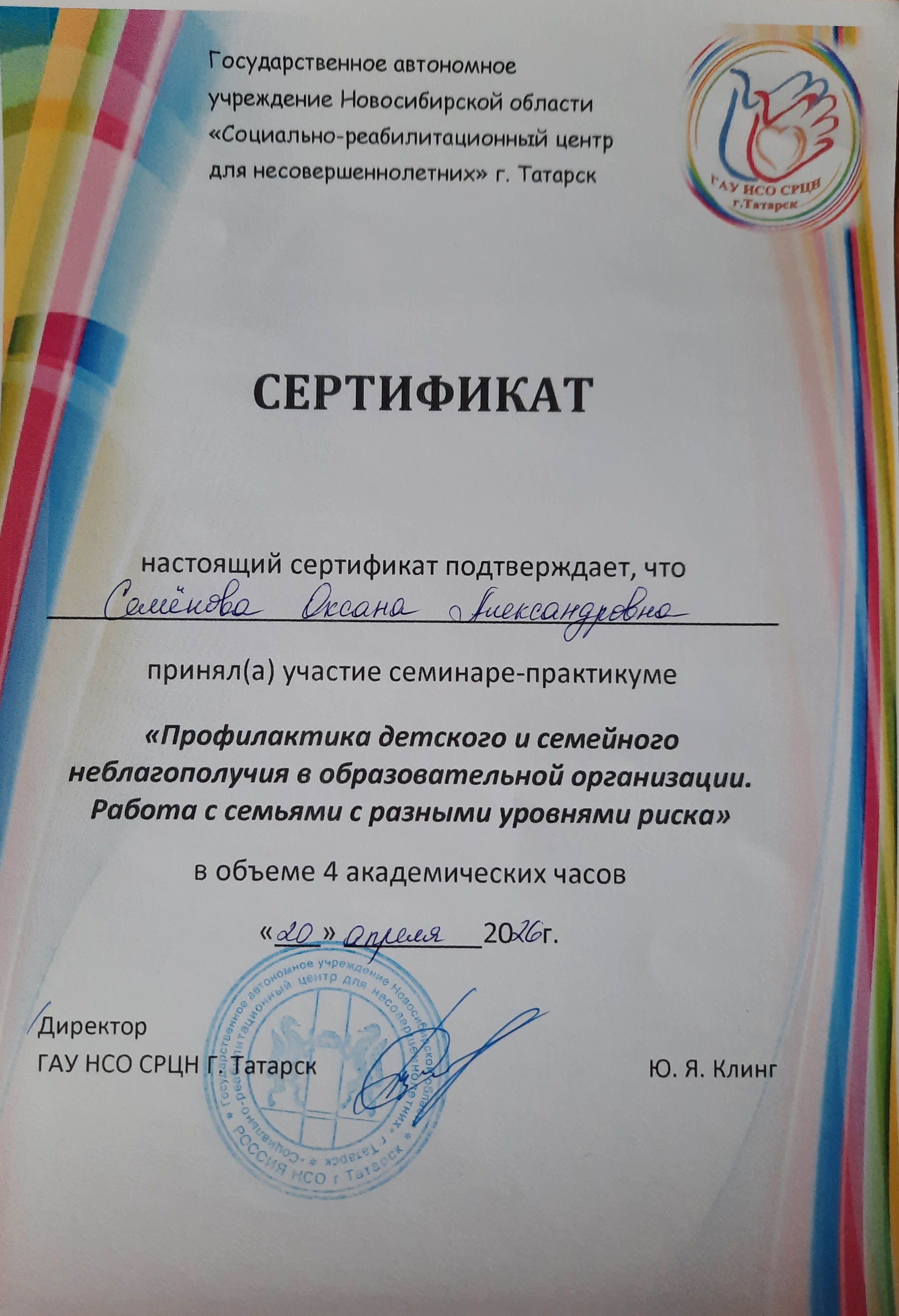 Сертификат участника в семинаре - практикуме "Профилактика детского и семейного неблагополучия в образовательной организации. Работа с семьями с разными уровнями риска"